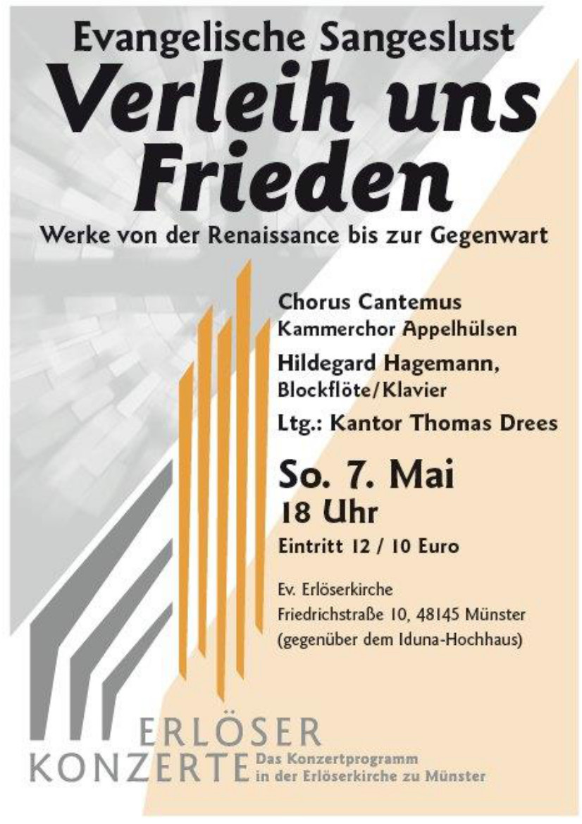 Am Sonntag, 07.05.2017 um 18.00 Uhr tritt der Kammerchor Chorus Cantemus aus Appelhülsen unter der Leitung von Kantor Thomas Drees in der Ev. Erlöserkirche Münster auf. Die Sängerinnen und Sänger des Chores freuen sich über die Einladung des Kirchenmusikers Ludwig Wegesin. Es ist eine Auszeichung, so die Vorsitzende des Chores Birgit Witulski, sich an der bekannten Konzertreihe der evangelischen Kirche in Münster zu beteiligen. Unter dem Konzerttitel "Verleih uns Frieden" werden Werke von der Renaissance bis zur Gegenwart aufgeführt. Passend zum Lutherjahr ist das Konzert nach den Stücken von Mendelssohn-Barthody und Schütz benannt, die sich in ihren Kompositionen auf die Liedstrophe "Da pacem, Domine" von Martin Luther beziehen. Außerdem werden Werke von Bach, Nysted, Bruckner, Distler, Rutter und weiteren aufgeführt. Hildegard Hagemann begleitet den Chor am Klavier und an der Blockflöte.